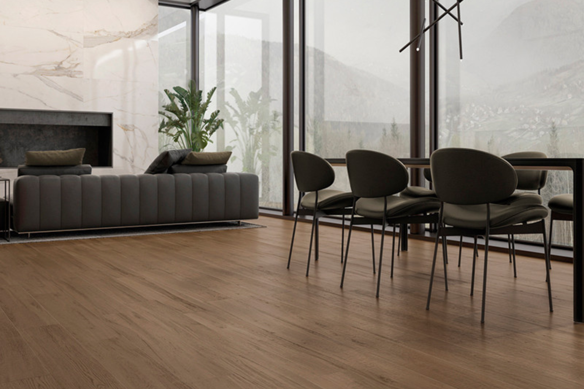 Living rooms and bedrooms benefit from the cozy design of wood, while adding the durability under heavy traffic that porcelain offers.